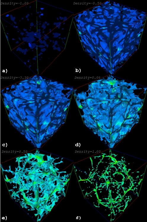 The figures shows configurations enclosed by 3D isodensity contours at z=3. At low densities (first panel, overdensity = 0.1), the contours enclose isolated amorphous regions. These lie at the centers of minivoids, underdense regions a few (comoving) megaparsecs across, as shown in the second and third panels (overdensities = 0.3 and 0.5). The systems corresponding to the cosmological average density (overdensity = 1), in the fourth panel show a cell-like or spongy morphology, with underdense regions separated by wall-like partitions of varying thicknesses. The next panel (overdensity = 3), shows a filamentary network emerging from the intersections of the walls. The network, or cosmic web, is prominent in the final panel (overdensity = 10). (From Zhang, Meiksin, Anninos & Norman 1998.)