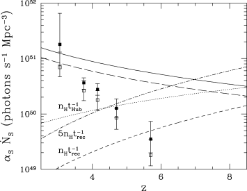 cent. Also shown are the minimal ionizing photon production rate nHt1H required to ionize the IGM over a Hubble time (dotted line), and the rate of recombinations for clumping factors of